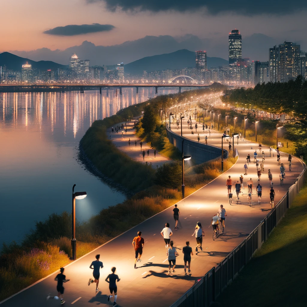한강 공원은 부드러운 조명으로 환하게 밝혀져 있으며, 한강의 고요한 물 위에 반사된 불빛이 아름다운 경관을 만들어냅니다. 공원에서는 사람들이 산책을 즐기고, 피크닉을 하는 모습을 볼 수 있습니다. 서울의 스카이라인과 고층 건물들이 배경을 이루어 그림 같은 장면을 연출합니다.